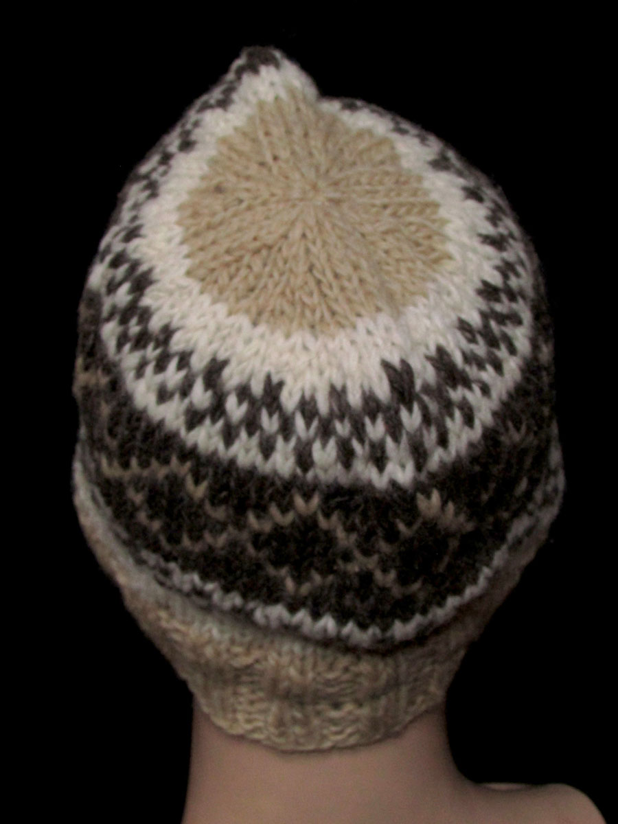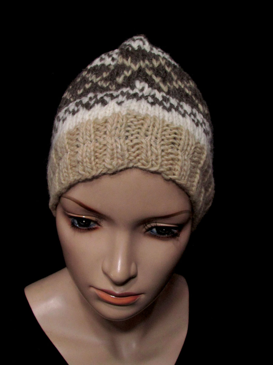 This is a funky unisex Round cap from Nepal. This is a cream, Brown and white color cap made from 100% wool. It has a warm fleece inner lining. This hand knitted woolen cap is soft, tight knitted and of good quality.