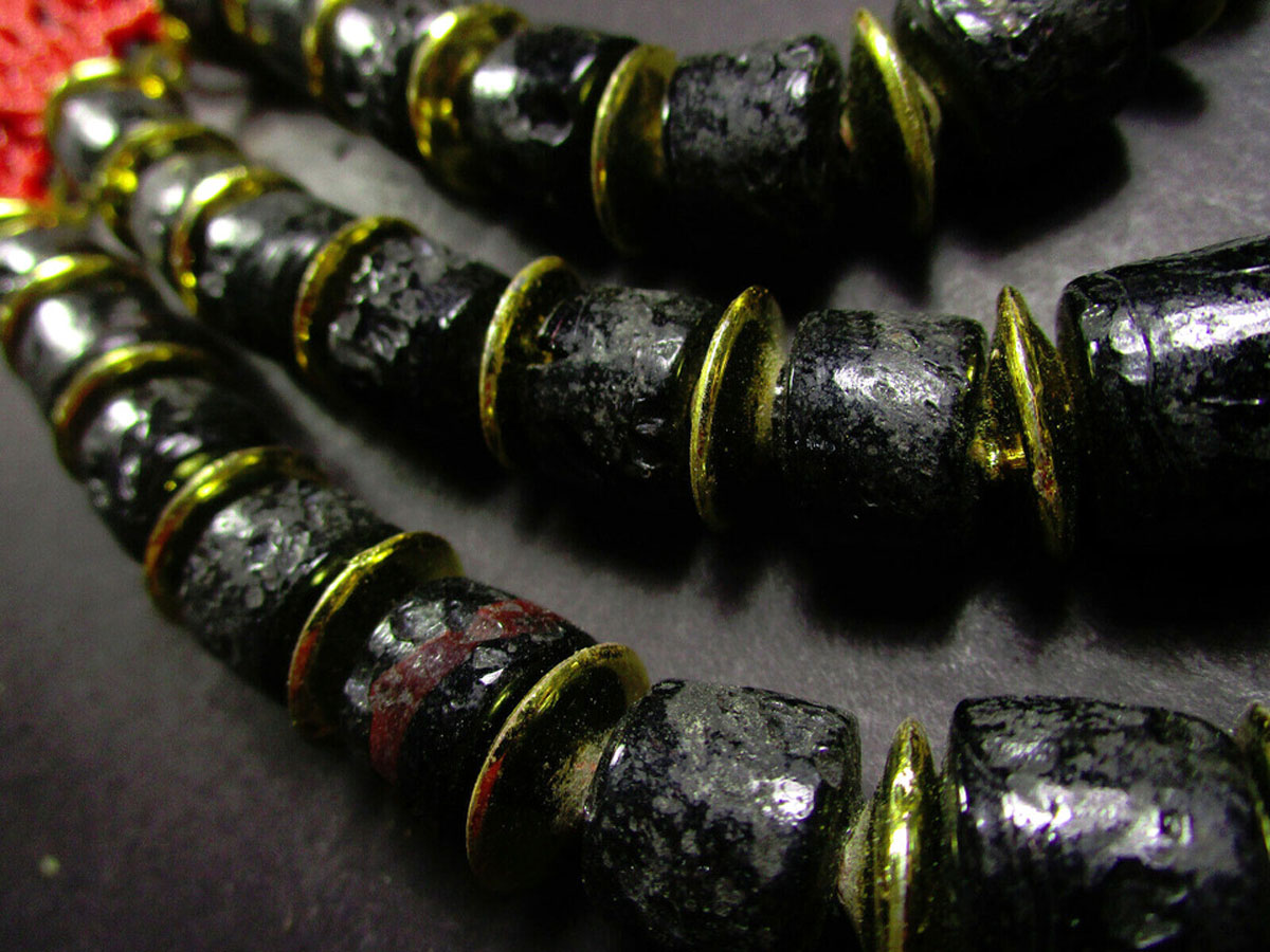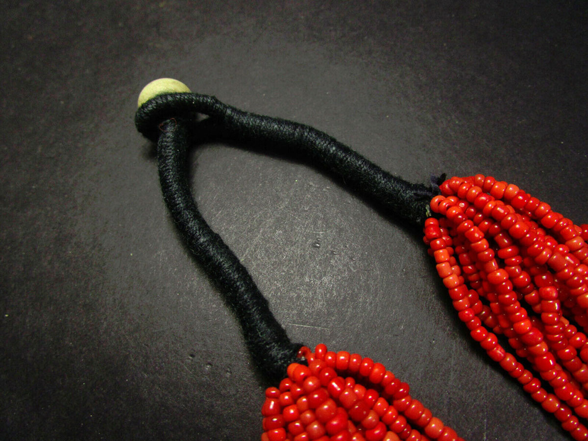 This striking necklace features a multi-strand design with black glass beads and a prominent black glass center drop, embodying the bold and intricate style of Naga tribal craftsmanship.